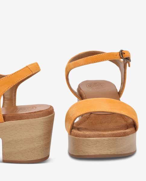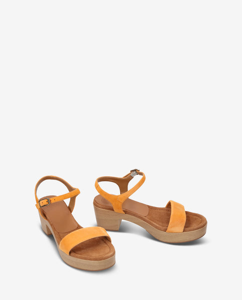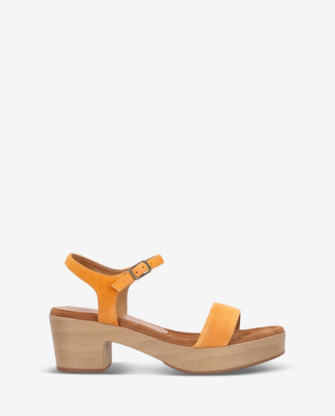 Sandalia de punta redonda fabricada en piel metalizada. Pulsera en el tobillo ajustable con hebilla metálica. Bloque ligero con tacón de 5.5cm de altura y plataforma de 3cm efecto madera. Suela de goma ligera y antideslizante. Esencia Unisa en estado puro.