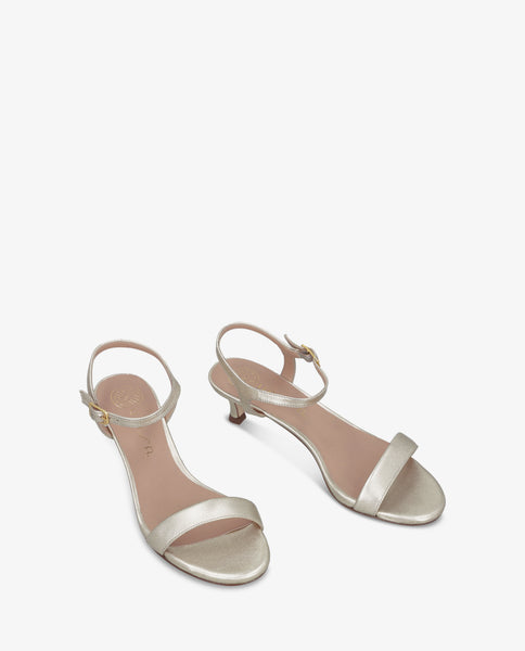 Sandalia de punta redonda fabricada en piel metalizada. Tacón fino de 5 cm de altura forrado en piel metalizada al tono. Pulsera en el tobillo ajustable con hebilla metálica y suela de cuero. Un complemento perfecto para este verano.
