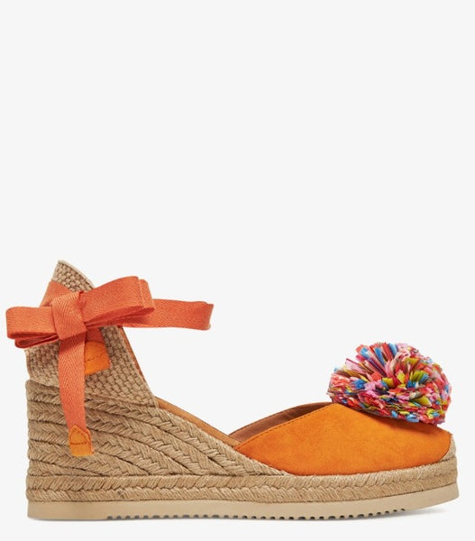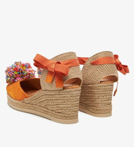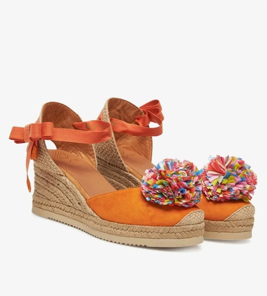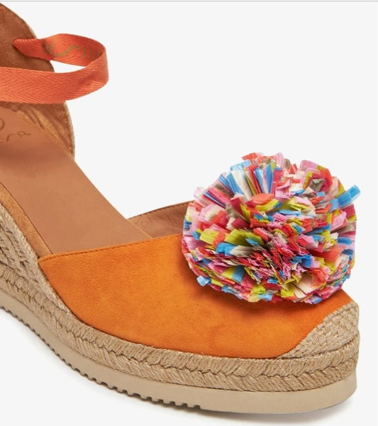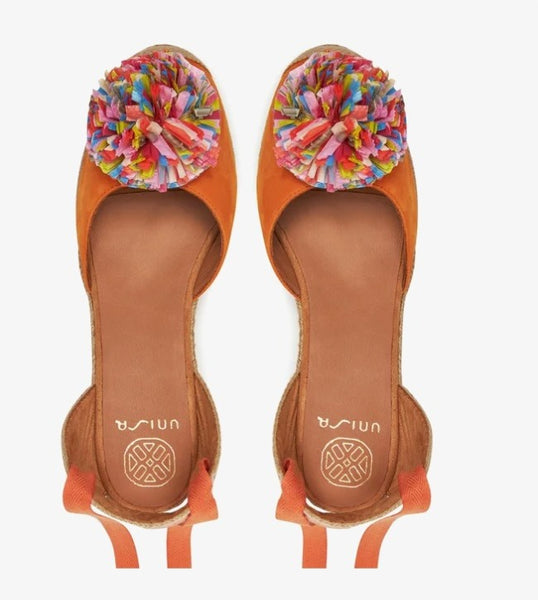 Alpargata de punta redonda fabricada en ante. Adorno de rafia en forma de flor. Talonera de rafia y ajustable con cordones al tono. Plataforma de 2cm y cuña de 7,5cm forradas en yute. Suela de EVA más ligera y flexible que nunca gracias a la tecnología Superlight de Unisa.