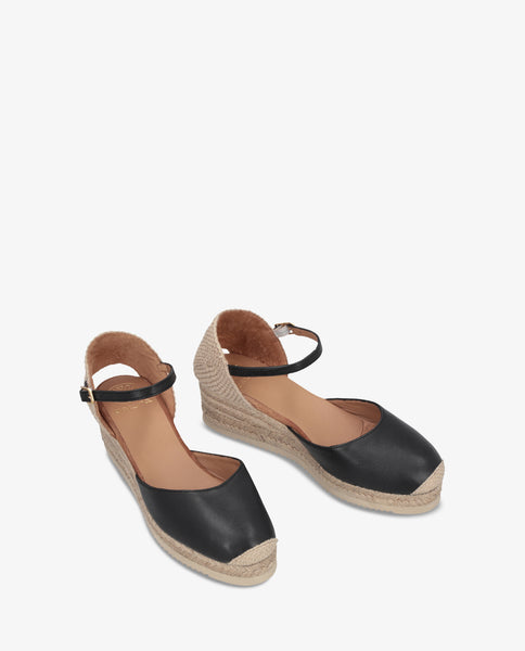 Alpargata de punta redonda fabricada en piel. Talonera de rafia y ajustable con hebilla metálica. Plataforma de 1cm y cuña de 3cm forradas en yute. Suela de EVA más ligera y flexible que nunca gracias a la tecnología Superlight de Unisa. ¡Siente la comodidad al ponerte estas alpargatas!