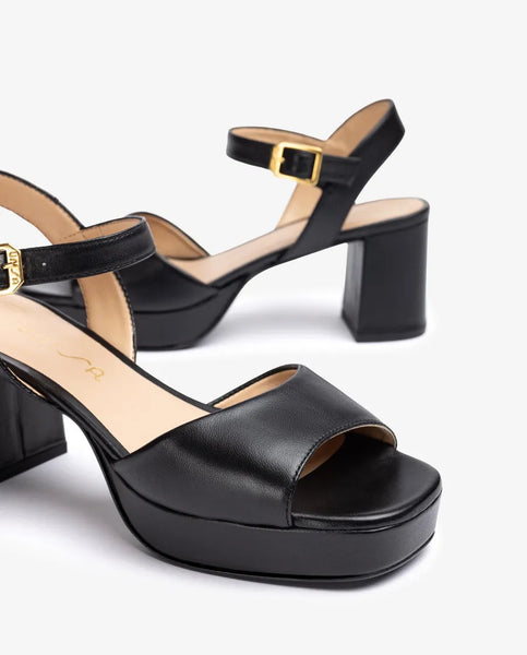 Sandalia de punta cuadrada fabricada en piel. Tiras anchas delantera y pulsera en el tobillo ajustable con hebilla metálica. Tacón de 7cm y plataforma de 2,5cm forrados al tono. Suela de goma ligera y antideslizante. ¡Nuestras sandalias NEY se han convertido en todo un clásico!
