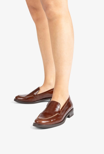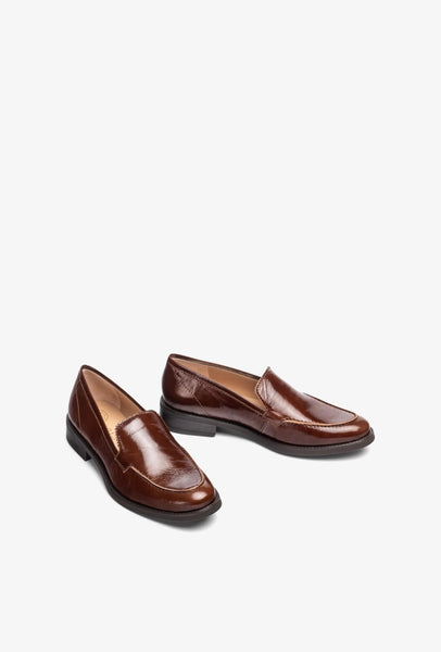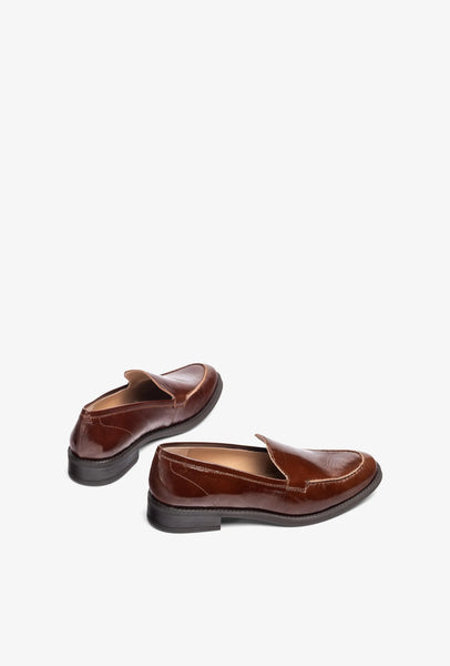 Mocasín de punta redonda fabricado en charol arrugado. Tacón bajo de 3 cm de altura efecto madera. Suela de goma flexible, ligera y antideslizante. Disponible en varios colores, ¿con cuál te quedas?
