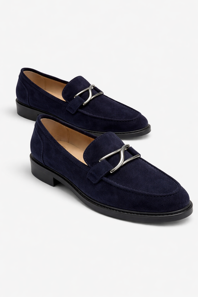 Mocasín plano de punta redonda fabricado en ante. Detalle de adorno metálico en el empeine. Suela de goma ligera, flexible y antideslizante. ¿Clásico? Sí, pero de moda.