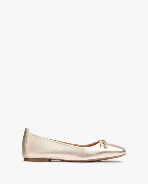 Bailarina de punta cuadrada fabricada en piel metalizada. Detalle de lazo de piel al tono con adorno de cristales. Suela de goma ligera, flexible y antideslizante. Imprescindibles para tener un estilo muy personal.