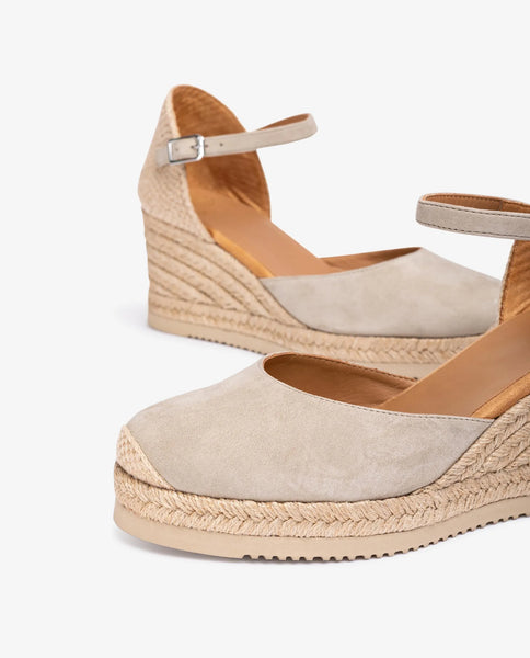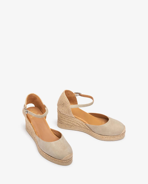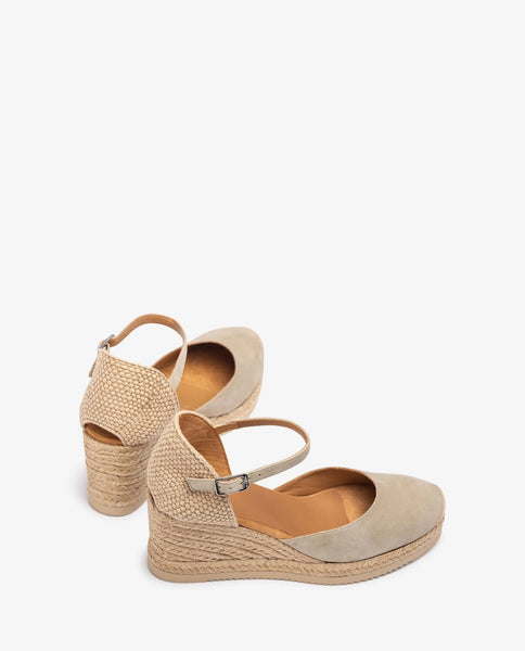 Alpargata de punta redonda fabricada en ante. Talonera de rafia y ajustable con hebilla metálica. Plataforma de 2cm y cuña de 7,5cm forradas en yute. Suela de EVA más ligera y flexible que nunca gracias a la tecnología Superlight de Unisa. Nuestro modelo CACERES se ha convertido en todo un clásico de Unisa.