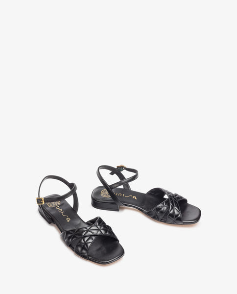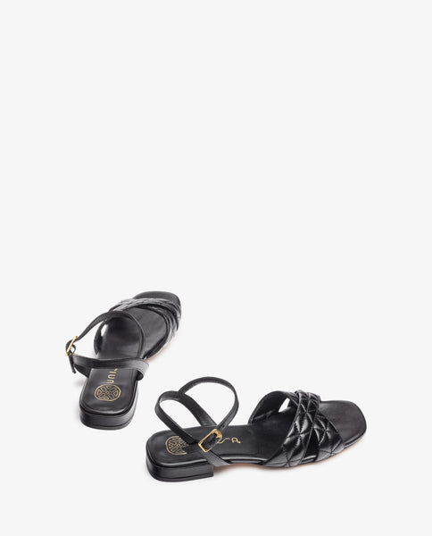 Sandalia plana de punta cuadrada fabricada en piel. Tiras acolchadas con pespuntes en la parte delantera y ajustable con hebilla metálica en el tobillo. Tacón bajo de 2cm de altura forrado en piel al tono. Suela de cuero.