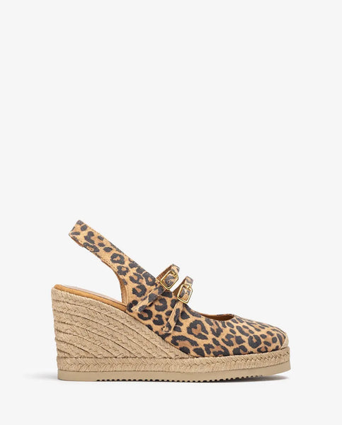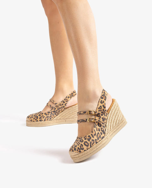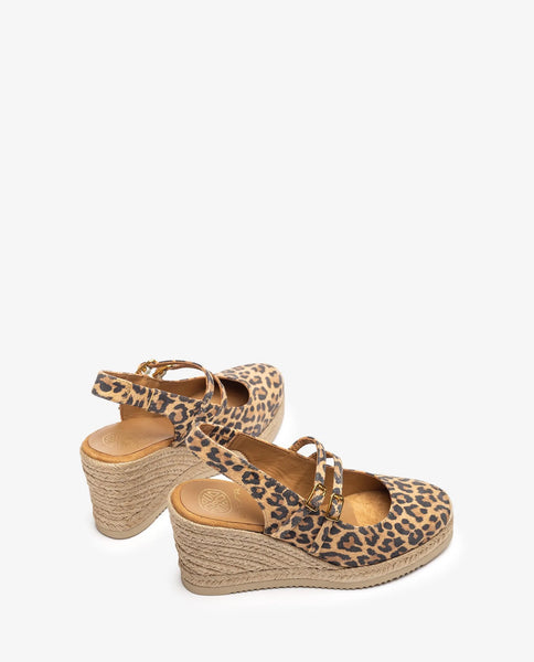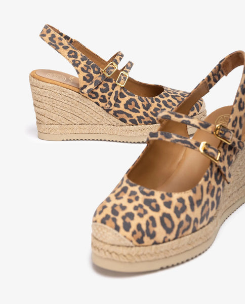 Alpargata destalonada de punta redonda fabricada en ante estampado animal print. Doble tira en el empeine. Plataforma de 2cm y cuña de 8,5cm forradas en yute. Suela de EVA más ligera y flexible que nunca gracias a la tecnología Superlight de Unisa. Únete al estampado de moda.