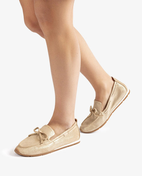 Mocasín estilo nátuco de punta redonda. Fabricado en ante metalizado. Detalle de lazo en ante al tono. Plantilla interior extraíble y sin forro interior para su comodidad. Suela de goma muy ligera, flexible y antideslizante. Con nuestro modelo DIMAS eliges moda y comodidad.