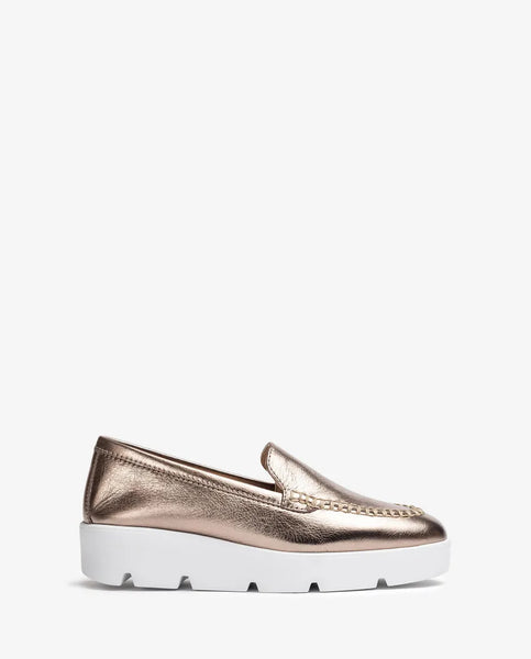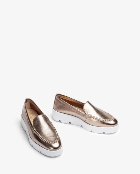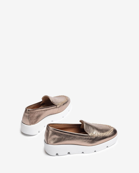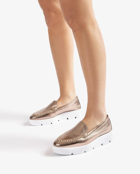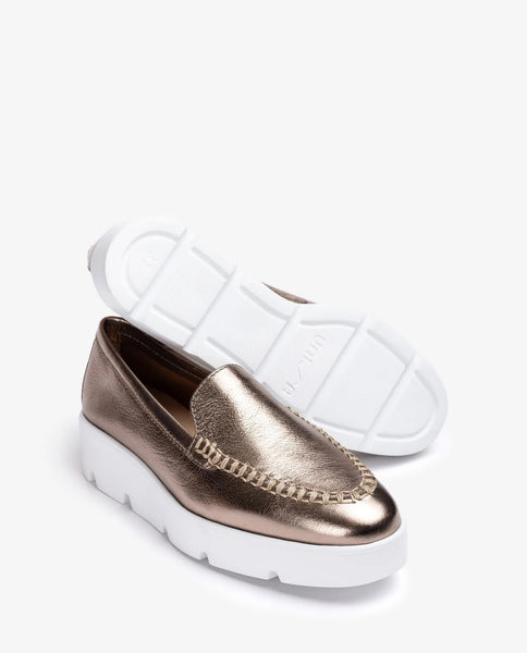 Mocasín de punta redonda fabricado en piel metalizada. Plataforma de 2,5cm y tacón de 4cm. Piso de EVA más ligero y flexible que nunca gracias a la tecnología SuperLight. Forro de tejido muy suave y cómodo.