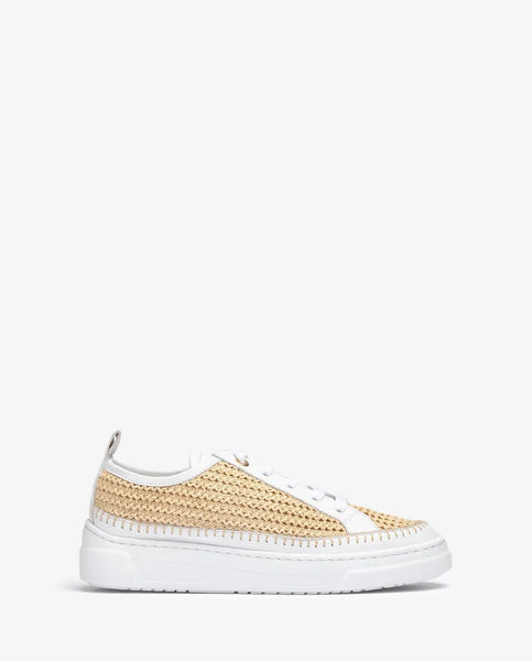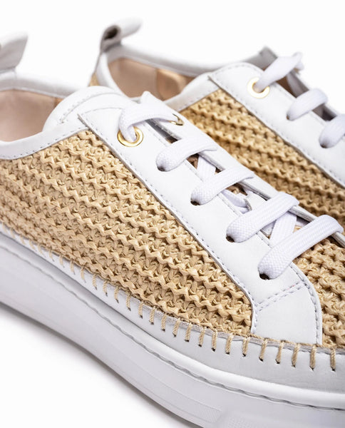 Deportivo de punta redonda fabricado en piel y rafia. Detalle cosido natural. Suela