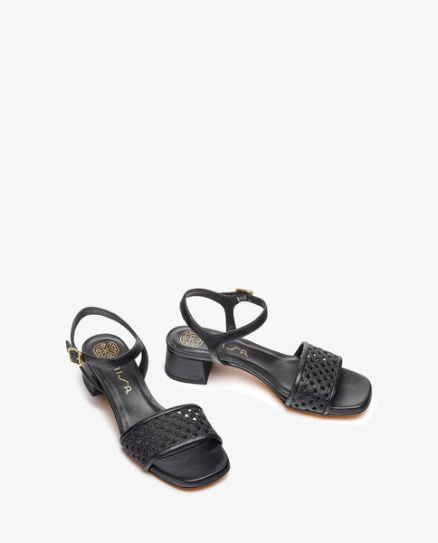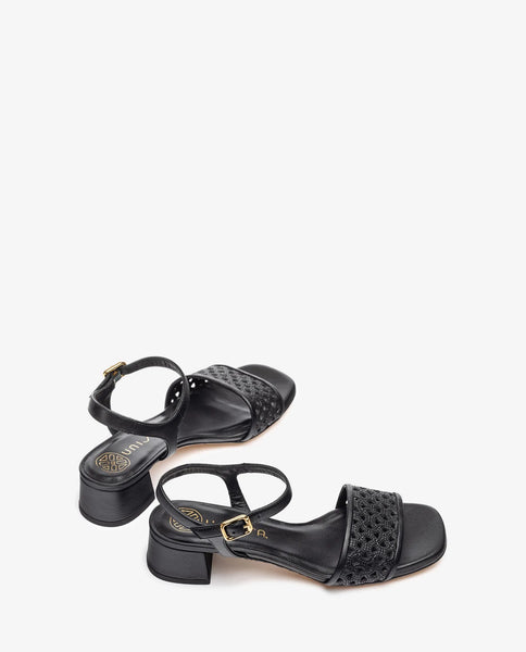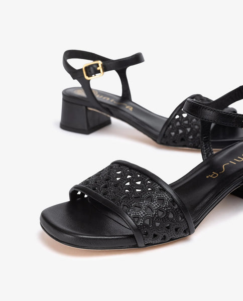 Sandalia de punta cuadrada fabricada en piel. Pala ancha con picados y ajustable en el tobillo con hebilla metálica. Cómodo tacón de 3,5cm de altura forrado en piel al tono. Suela de cuero. Un diseño elegante, atemporal y muy cómodo.