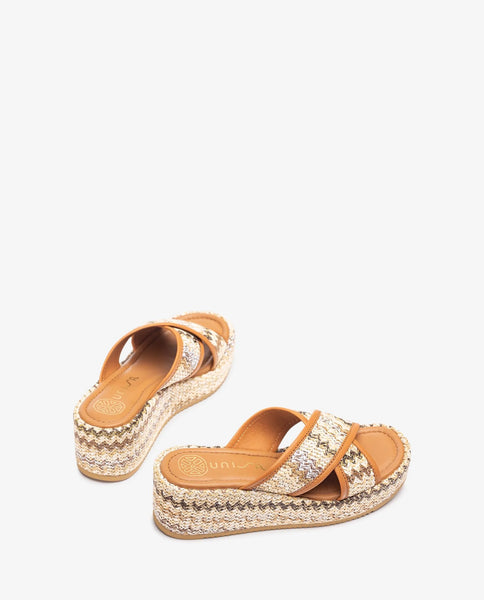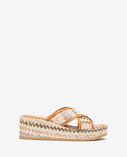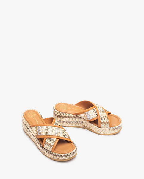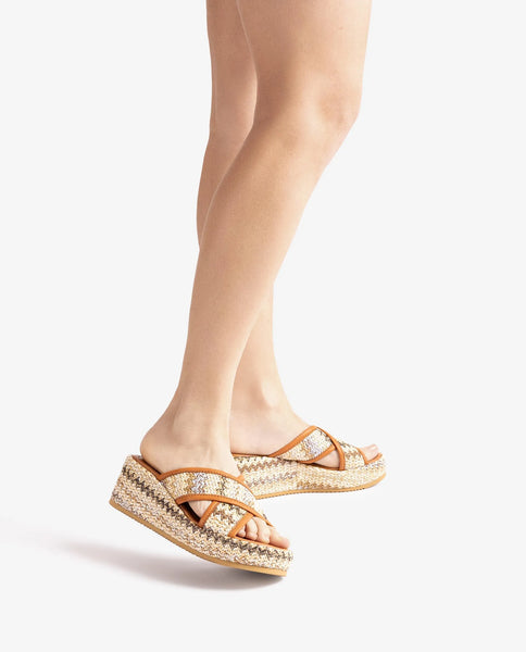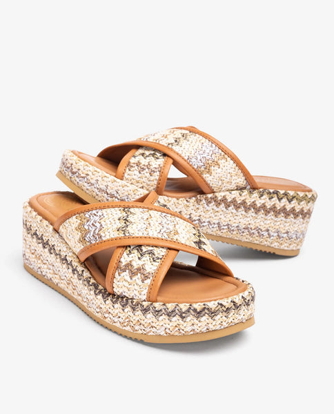 Sandalia de punta cuadrada fabricada en piel y rafia. Tiras acolchadas anchas de rafia cruzadas en el empeine. Bloque de 3cm de plataforma y 6,5cm en el tacón forrado en rafia natural. Extra acolchado en toda la planta para su comodidad. Suela de goma ligera, flexible y antideslizante. Unas sandalias que respiran Mediterráneo.