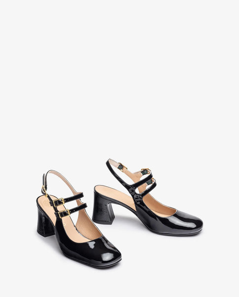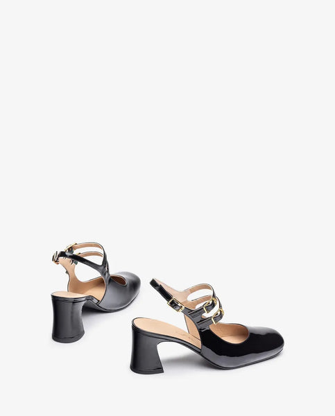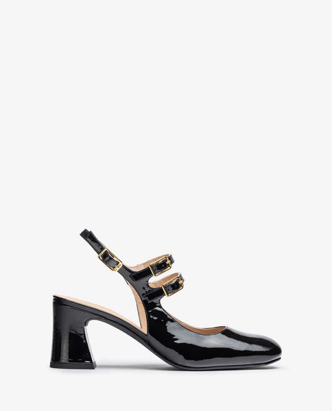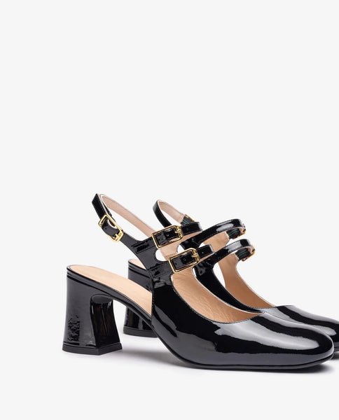 Merceditas destalonada de punta cuadrada fabricada en charol. Doble tira en el empeine con hebilla metálica. Tacón ancho de 6cm de altura forrado al tono. Suela de goma ligera, flexible y antideslizante. La colección de verano 2024 de Unisa será tu mejor complemento.