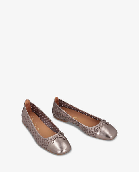 Bailarina plana de punta cuadrada. Fabricada en piel metalizada con lazo al tono. Detalle de picados y forro de rejilla para su comodidad. Suela de goma ligera, flexible y antideslizante. Un clásico renovado que no te dejará indiferente.