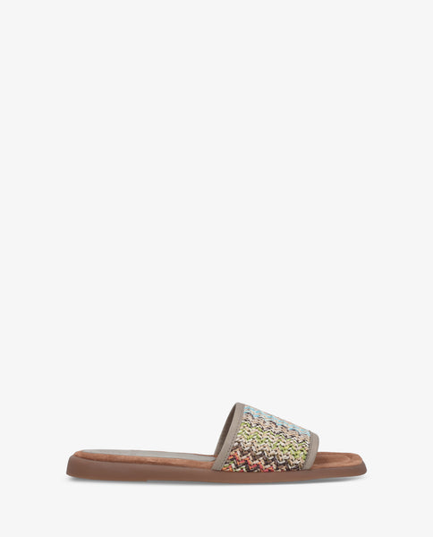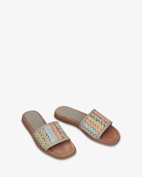 Sandalia plana con pala ancha fabricada en rafia natural y piel en contraste. Extra acolchado en toda la planta para su comodidad. Suela de goma ligera, flexible y antideslizante. Una fusión perfecta entre artesanía e innovación.
