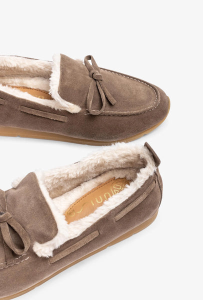 Mocasín estilo naútico de punta redonda. Fabricado en ante. Detalle de lazo en ante al tono. Plantilla interior extraíble y forro interior cálido de pelo. Suela de goma muy ligera, flexible y antideslizante. Comodidad y calidez en un mismo mocasín.