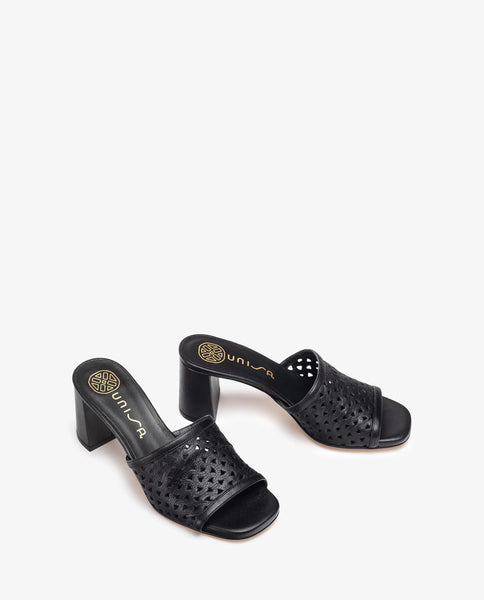 Sandalia de punta cuadrada fabricada en piel. Pala ancha con picados. Tacón de 6,5cm de altura forrado en piel al tono. Suela de cuero. Un modelo indispensable para este verano.